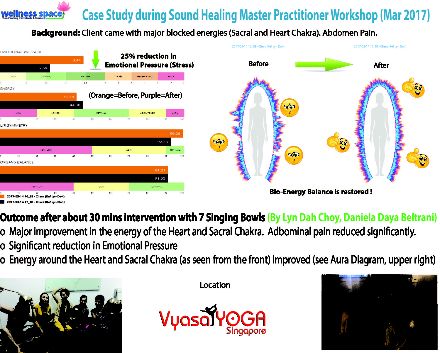 A simple case studies during the March 2017 workshop in Singapore is captured below. Another example of what we do in this workshop is available here (Heart Rate Variability). These tools provide excellent opportunities for the participants to understand how the human bio-energy and physiology changes during the interventions they learn during the workshop !