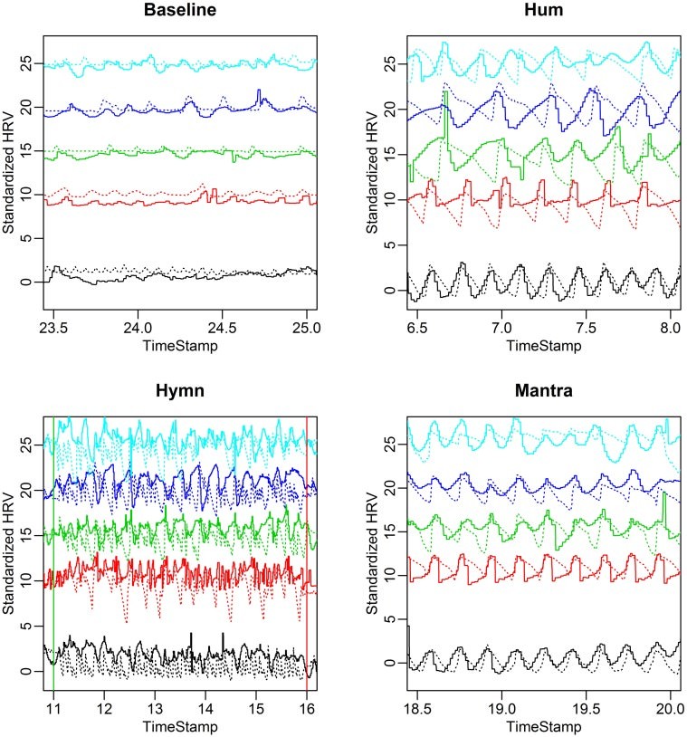 Studies have down that singing, humming and chanting has significant impact on our nervous system (autonomic nervous system) and the mind ! The study clearly indicates how the breathing rate (shown in dotted lines) and heart rate variability are in sync during Mantra Chanting ! This denotes a well balanced autonomic nervous system (and a balanced nervous system is a critical requirement for us to be in balanced and good mood. It also denotes healthy state of mind (which drives health body).