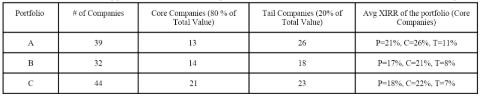 - Tail Companies, i.e 23 companies in Portfolio C holding approx 20% of the investments (about Rs. 3.5 lacs) have contributed an aggregate XIRR of 7% so far. This amount would take about 10 years to double. (Table 1)