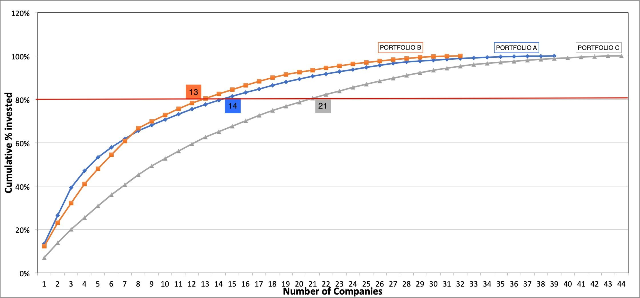 Figure 1 – Pareto analysis of 3 portfolios (X-Axis shows number of stocks and Y-Axis shows the total % of value in the portfolio).
