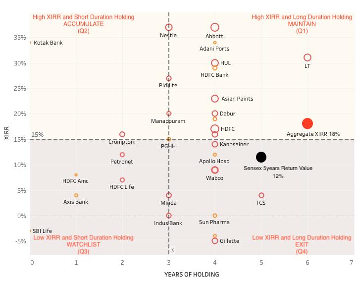The “core” and “tail” stocks were mapped on a visual i.e. (a) Years of holding i.e. numbers of years since the first investment, on X-axis (b) XIRR on the Y-axis with shown in Figure 2 (bubble size shows % investment in each company of the total investment). In this portfolio, the number of core companies are 21 and 24 tail companies.