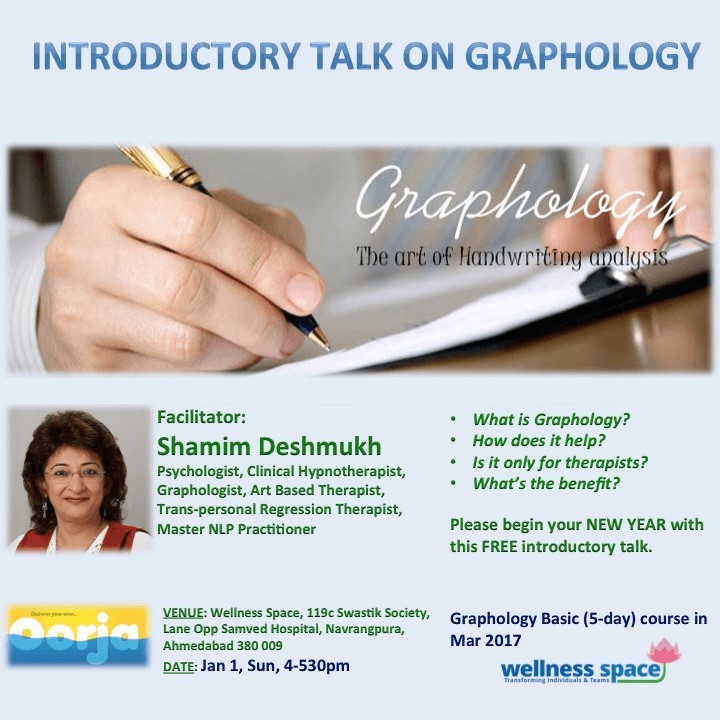 Begin your new year with something more meaningful. Learn how to analyze and interpret handwritings. Shamim is an expert in handwriting analysis and integrates her knowledge in Hypnotherapy, Psychology, Vedanta and Tras-Personal Regression Therapy with Graphology. Shamim is a counselling psychologist based in Mumbai and she also runs a pre-school (Little Learners Academy) for past 3 decades.