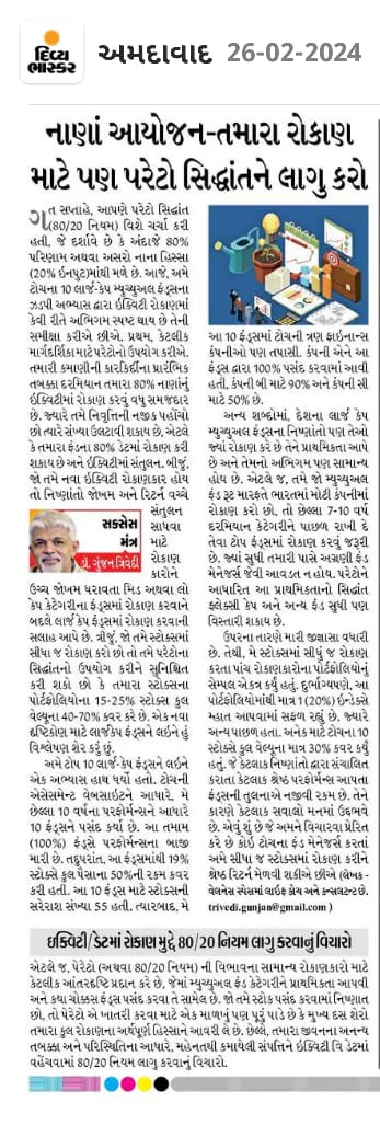 Therefore, the concept of Pareto (or 80/20 rule) provides several insights for the common investors, including which mutual fund category to prioritise and which specific funds to select. If you are an expert in stock picking, Pareto also provides a framework to ensure that core ten stocks cover a meaningful portion of your total investment. Finally, depending on your unique life stage and situation, consider applying the 80/20 rule in distributing the hard-earned wealth into equity vs debt.