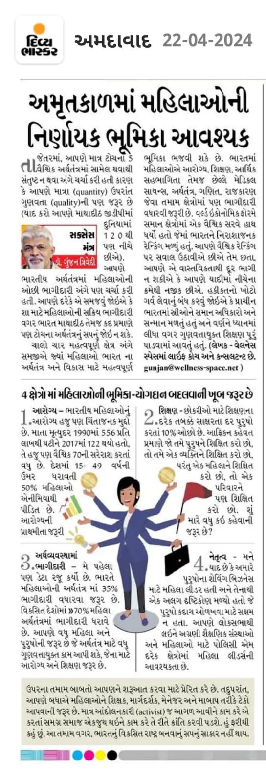 The above ideas do not cover everything, but they get us started. Additionally, we need support from both men and women in their roles as parents, mentors, managers, and policymakers. We need to shift the focus by having everyone in society take up this work rather than letting the activists (આંદોલનકારી?) manage it. Let me repeat: without all of the above, India’s dream of becoming a developed country won’t happen!