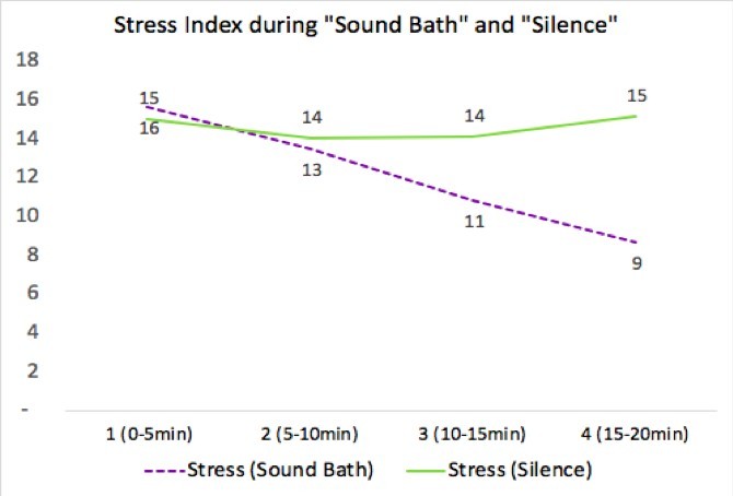 The impact on the subject was measured using Emwave Pro device and the data was analyzed using Kubios HRV Premium software for obtaining heart rate, heart rate variability and stress index data. The subject first experienced sound bath with singing bowls and after 2 weeks went through similar session in silence. The singing bowl “sound bath” session resulted in more reduction in stress index and an increase in heart rate variability parameters, as compared to the changes during the “silence session”.